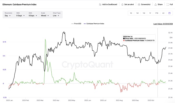 如果鲸鱼继续提供市场所需的流动性,那么 ETH 可能会成为下一次上涨的最大涨幅之一。此外,据专家称,Coinbase 溢价指数是另一个重要的链上指标,目前凸显了以太坊鲸鱼的上升趋势。CryptoQuant 图表显示,以太坊的 Coinbase 溢价指数自 10 月 14 日以来一直为正。