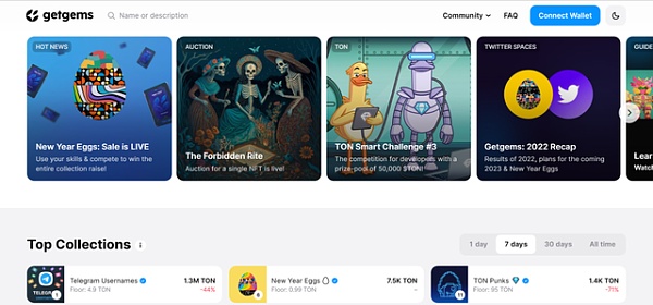 Getgems 是 TON 区块链上拥有丰富 NFT 收藏品标的的市场之一。在这个平台上,用户可以购买、出售、铸造和转移 NFT。每次交易都需要支付 5% 的费用给 Getgems,不过铸造或转移 NFT 不会产生额外费用。