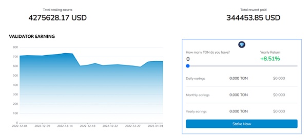 TonStake 自称是 TON 区块链上的第一个,也是最大的质押池。它为 TON 的质押者提供了大约 8.51% 的年化收益率,但用户需要支付 10% 的服务费。此外,TonStake 还为第三方服务提供商提供 API,以便集成质押功能。截止到 2023 年 1 月 3 日,TonStake 的总质押资产价值已超过 420 万美元,并向用户分发了价值超过 34 万美元的质押奖励。