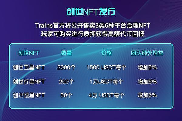 Trains官方将通过公开售卖3类6种平台治理NFT来奖励玩家,玩家可以购买这些NFT进行质押,获得高额的代币回报。