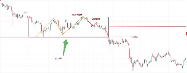根据形态学理论,比特币在接近形态低点或形态三分之二低点的位置通常会出现上涨。因此,在比特币价格接近25000或26000附近买入或中长线做多的朋友们现在不需要担心回撤,而是应该继续持有利润。在之前的熊市中,比特币在48000的高点也是因为形态学的理论导致下跌,不一定在较低位置开始下跌,而是在形态学相对接近高点的位置。根据这个理论,从33000起跌到48000,价格下跌了大约15000,所以从33000开始减去15000,理论的下跌目标大约在18000附近。因此,在2022年,我们可以在20000下方分批买入比特币。