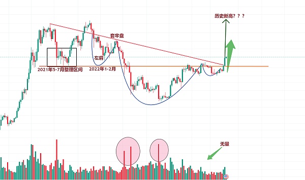 根据头肩底形态,比特币在2022年1月到2月期间形成了一个左肩,后来价格一路下跌,并且出现了一些主力制造的危机。从量能上看,主力借走了这个区间的量。目前,比特币突破了2021年5月到7月的整理区间,并且价格涨了一倍。我个人认为,上涨空间还是存在的,因为现在买入的散户已经离场,所以上涨肯定还有空间。不排除短期的震荡或挑战更高的目标,即历史新高。