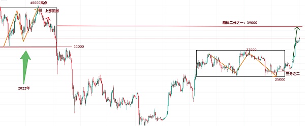 当前的行情与之前的形态相似,因为在相对较低的位置上突破了箱体整理区间。根据理论,突破位置为32000,与25000之间的差距为7000美元,所以理论上涨空间应该在39000附近。这个位置也接近2022年箱体一半的位置,价格大约为39000。我认为短期整理之后,比特币可能会继续上涨,并且在减半之前有可能挑战48000美元的高点,这是箱体的另一个压力位。我的观点是在产量减半之前,比特币有可能挑战这个位置。