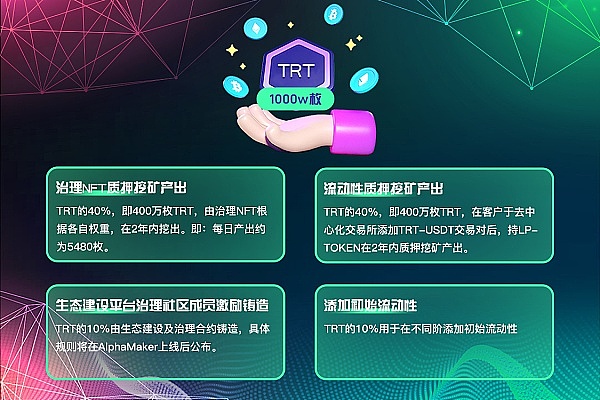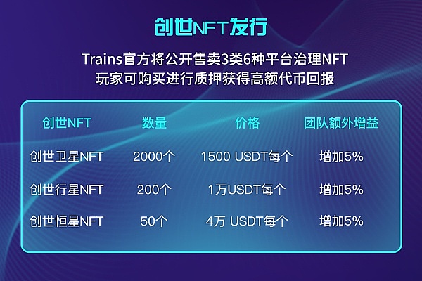 Trains官方将公开售卖3类6种平台治理NFT,玩家可购买进行质押获得高额代币回报。创世NFT销售收入的50%将用于添加TRT的初始流动性,交易对为:TRT-USDT,1个TRT换1个USDT。