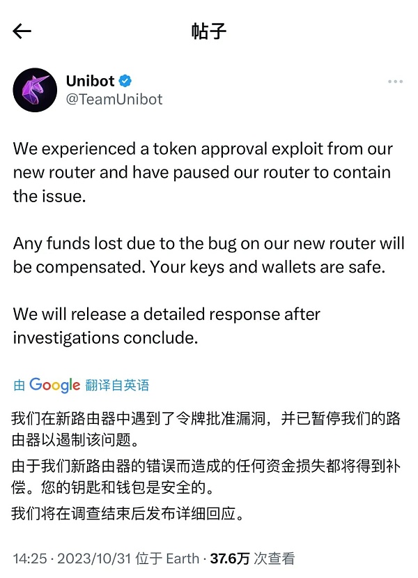 突发消息:电报机器人领导项目 Unibot 遭受黑客攻击,幸运的是,损失金额有限,资金已被暂时撤回。