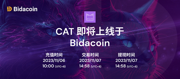 根据官方的公告,Bidacoin将于2023年11月06日 12:00 开放 CAT 的充币和提币的业务,于2023年11月07日 14:58 开启 CAT /USDT 交易对。