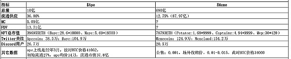 这里对SMeme的估值最核心的就是通过上面的数据预估meme占ape多少份额。按NFT市值占比算meme/ape =1/5;按媒体数据,两者数据相差不大,而且meme数据更好一点。但无疑BAYC的影响力相对较高,社媒评比为1/1。因此,我将取目前ape市值1/2为下限,开盘市值1/7为上限。假设meme的价格区间限定,若按开盘Sape流通市值37.8亿、btc价格系数比:41000/34000=1.2、流通量系数比: 27%/12.75%=2.11,若取FT占比1/5,37.8/1.2/2.11/5=2.98亿,此时SMeme价格=.034,此时Seme hC为2.98亿,市值排名将为120名,接近1inch,而现Sape MC为.05亿。