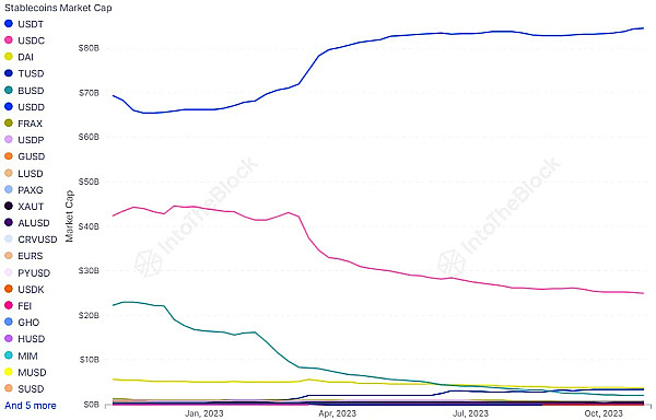 在这一过程中,一些稳定币遇到了挑战和困境。USDT作为加密市场中最广泛使用的稳定币,在过去一年中经历了显著的增长,巩固了其地位。然而,其他稳定币如USDC则面临了萎缩,外汇储备存放在一家破产的银行,导致市值下降。