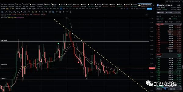 关于MASK项目,你提到它相对于DOGE属于风险偏好更强的项目,因此可能具有更大的价格波动性。目前,它已经突破了下降趋势线,可能显示出一定的上升趋势。你还指出了下方的防守区域在3.4到3.5美元之间。作为一个WEB3.0领域的龙头项目,另外有与马斯克相关的热度,MASK有着被炒作的潜力!