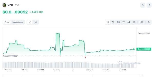 As of yesterday, the price of KEK was $0.000000009037, with a 24-hour trading volume of $131,709. In the past 24 hours, the price of KEK has declined by 6.50%. According to CoinMarketCap, it ranks 1486th, with a real-time market capitalization of $556,896. The circulating supply of KEKE coins is 74,280,393,141,279, with a maximum supply of 77,777,777,777,777 KEKE coins.