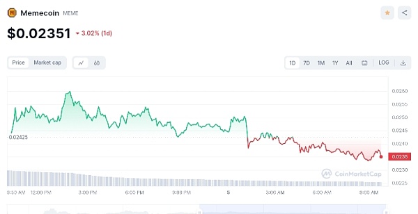 As of yesterday, the real-time price of MEME was $0.024814, with a 24-hour trading volume of $354 million. In the past 24 hours, the price of MEME has experienced a 3.71% increase. Currently, according to CoinMarketCap, MEME ranks 144th, with a market capitalization of $218 million. The circulating supply of MEME coins is 879.75 million, with a maximum supply of 6.9 billion MEME coins.