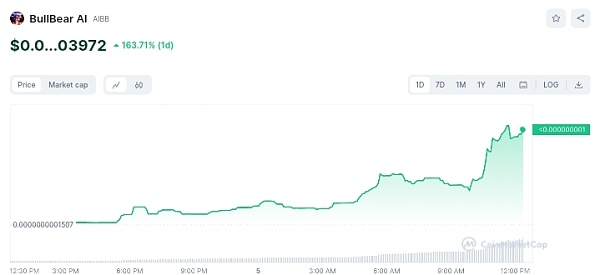 BullBear AI's real-time price in the past 24 hours was $0.0000000004077, with a trading volume of $399,538. The price of BullBear AI has increased by 134.26% in the past 24 hours. According to CoinMarketCap, it currently ranks 1459th, with a real-time market capitalization of $703,539. The circulating supply of AIBB coins is 2,045,833,899,998,990, with a maximum supply of 100,000,000,000,000,000 AIBB coins.