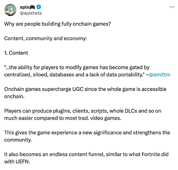 一位经营大型游戏公会的朋友曾经对我说: “如果你只是将 NFT 或代地集成到 Web3 游戏中,那么你就没有将极限推得足够远。你不妨去构建一个普通的游戏。成功者将是那些全力投入区块链的人。因此,我们有完全的链上游戏,或“自治世界”(AW),这就像 SpaceX 在 2000 年代初期进行的游戏一样。