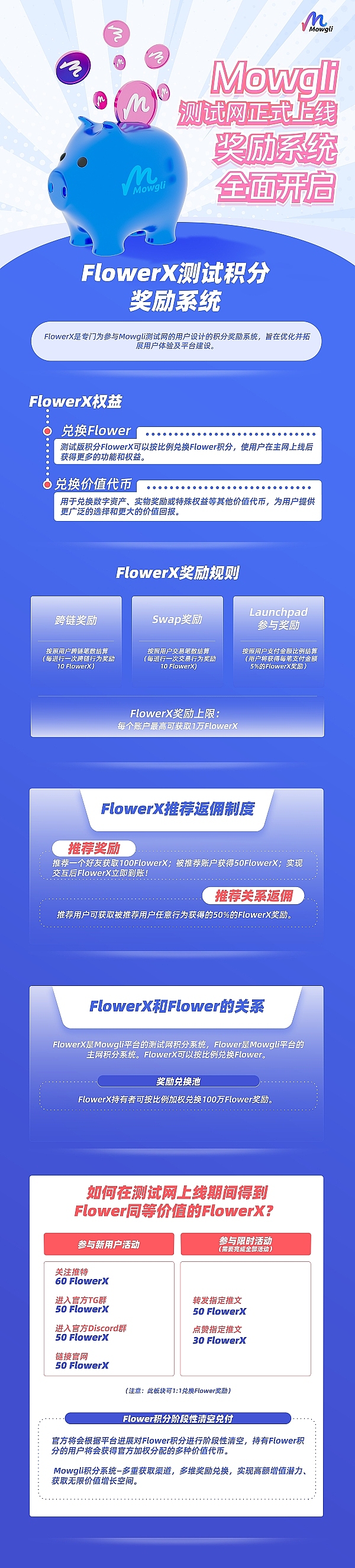 为了引导用户参与测试的积极性,Mowgli将同步上线测试网FlowerX积分奖励系统,并提供百万积分奖励和多份空投大奖,以吸引更多用户参与测试,提高测试的质量和有效性。