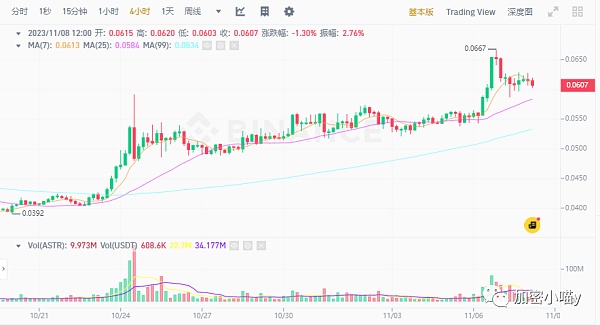 很多专家都认为,Astar(ASTR)可能会成为今年表现最出色的加密货币之一。根据我们的价格分析,随着加密货币市场逐渐恢复,我们预计 Astar 的最高价格可能维持在约 0.18 美元左右。在2023年,我们估计 ASTR 代币的平均价格可能达到 0.16 美元。然而,如果加密市场出现重大下跌趋势,我们也考虑到 ASTR 可能在2023年达到最低价约为 0.13 美元。请注意,这只是一种价格预测,实际价格会受多种因素的影响。下图为ASTR目前波动。