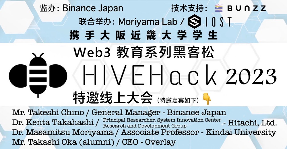 2023年11月24日至25日,IOST将在近畿大学学术剧院举办为期两天的第三届区块链教育黑客马拉松,名为「HIVEHack 2023」。这个活动是由IOST和Moriyama Lab共同举办,Binance Japan提供监办,Bunzz提供技术支持。