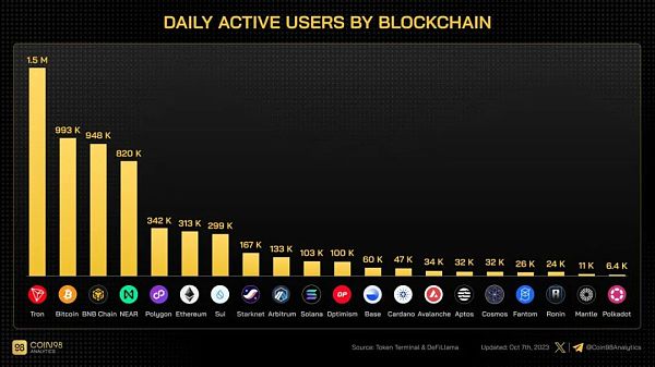 Coin98 Analytics最新发布的区块链日活跃用户榜单显示,波场TRON以150万高居第一,领先于Bitcoin、BNB Chain、以太坊等。