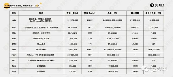 热度非常集中,第九、第十名的 foxs 和 lion 市值仅几十万美元, 7 日成交额约为 20 万美元;而 sats 7 日成交额为 1260 万美元,rats 为 294 万美元,BTCs 为 173 万美元,到了第四名的 cats 就锐减至 50 万美元。