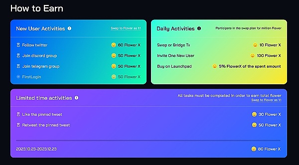 在本次Mowgli测试网中用户可通过交易行为获取FlowerX奖励,用户每进行一次交易操作,都将获得一次固定的FlowerX奖励。