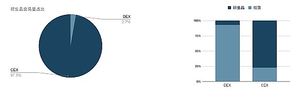 DEX平台上的衍生品交易量仅占总交易量的7%,而在CEX平台上,衍生品交易量占据了77%。这表明目前DEX平台上的衍生品市场发展还不如现货市场成熟,但也意味着DEX衍生品市场具备较大的增长潜力和上升空间。