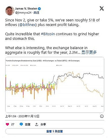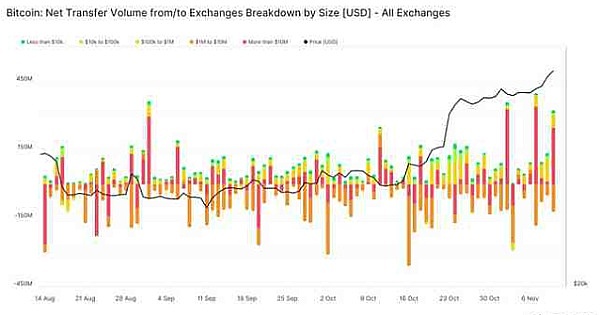 11 月 2 日左右,Bitfinex 上大约有 10 亿美元的存款,加上一些人抛售获利。这是一个好兆头,因为截至发稿时比特币的价格仍在上涨。