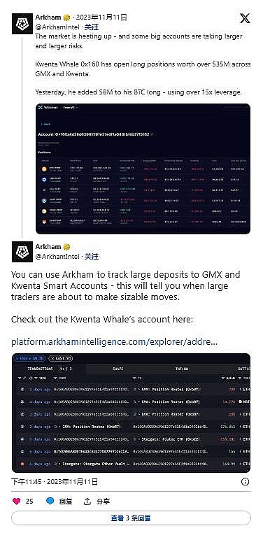 此外,Arkham Intelligence的数据显示,加密货币市场变得更加活跃,一些主要参与者正在承担更大的风险。一个名为 Kwenta Whale 0x160 的大账户在 GMX 和 Kwenta 上持有价值超过 3500 万美元的多头头寸。