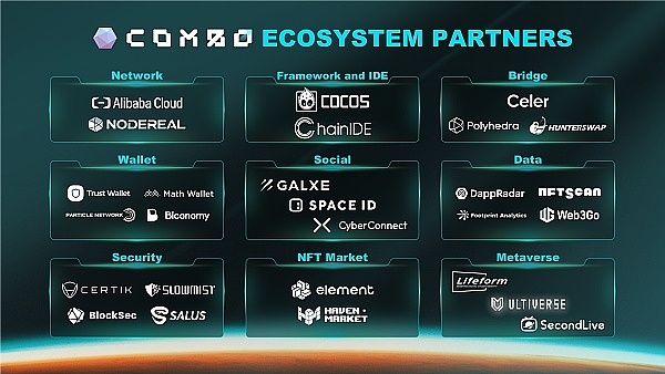 COMBO的生态布局都是围绕着游戏和元宇宙赛道展开的,从底层基础设施、网络、安全,到钱包、数据、NFT市场等基础应用,并且有重量级元宇宙项目Lifeform、Ultiverse以及SecondLive等支持,虽然不算庞大,但也五脏俱全。