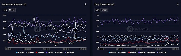 Arbitrum现在TVL高达59.3亿美金,流通市值14.5亿美金,FDV113亿美金,在未来6个月内没有新的解锁。 现在的日活地址15w左右,转账数量62w左右,紧跟Polygon,稳坐第一梯队。