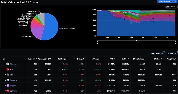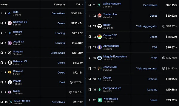 Arbitrum作为Layer2的龙头项目,一直以来都是被光环笼罩着。特别是2023年上半年的发币期间,更是成为了链圈的最热话题之一,一时间万人朝奉,变成了大家都挤破头想要加入的Layer2生态。而我们在Defillama的统计数据也能看出,Arbitrum已然超越了众多公链对手,在总锁仓量上在ETH,BSC和TRON之后排名第四,甚至超越了老牌Layer2侧链Polygon,妥妥的Layer2老大的架势。
