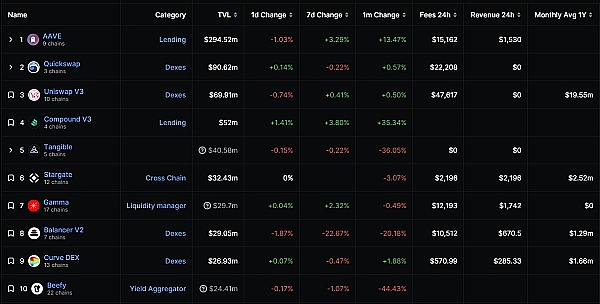 受益于平台发展初期正值DeFi蓬勃阶段,DeFi项目拓展相当迅猛,例如DeFi龙头项目Uniswap、Aave、Curve等进行多链部署时,第一站便选择Polygon。21年4月,Polygon推出1.5以美元DeFi发展基金,给予项目Matic奖励。当Polygon生态的DeFi项目,也有创新不足的缺点,链上TVL总体排名第五,已经被后起之秀Arbitrum超越。