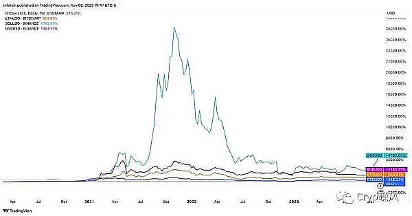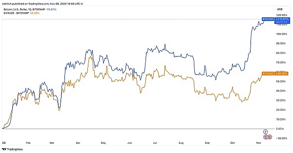 然而,随着人们对现货比特币ETF的兴趣与日俱增,剧本在2023年发生了逆转。现在,投资者普遍认为比特币是在经历了残酷的2022年之后,重新成为加密货币领域的最佳选择。与此相比,以太坊在价格方面明显落后于比特币,此外,核心基本面,如网络使用和活跃参与者等,在过去的一年中没有发生太大变化。