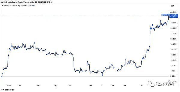 在2023年6月,比特币的价格上涨了超过20%。市场观察人士普遍认为,贝莱德这一备受瞩目的资产管理公司的影响力和声誉表明,他们不会轻率地提交没有成功预期的ETF申请。值得注意的是,截至目前,美国证券交易委员会尚未批准任何加密资产的现货ETF申请,尽管市场上的乐观情绪逐渐增强,但批准仍未到来。因此,尽管比特币在那个时候上涨了超过45%,但其发展过程并非一帆风顺。实际上,在10月份再次反弹之前,比特币几乎回吐了整个秋季的涨幅,显示出市场的波动性和不确定性。