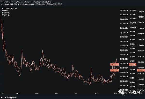 所有这一切都意味着,在ETF申请前的几个月,以太坊的前景相对黯淡。尽管在比特币的带动下开始小幅上涨,但其每月的实际波动率却是近五年来的最低水平。即使在牛市中,以太坊的隐含波动性(对未来波动性的预期)也落后于比特币。