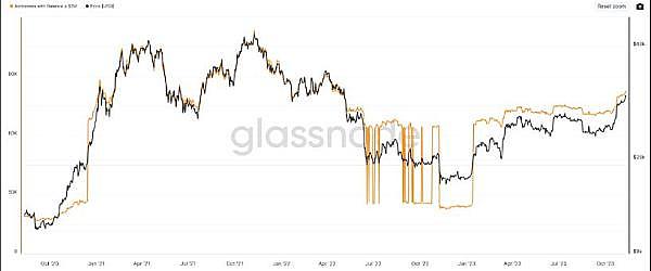 Glassnode的数据显示,2021年11月,持有价值超过100万美元比特币的地址数量达到了历史峰值,与上一次牛市高峰期相吻合。尤其是在2021年11月9日,注册的地址数量达到了惊人的112,573个,正好在比特币于同年11月10日创下69,000美元的历史新高前一天。