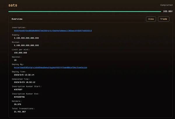 $SATS 部署于 2023 年 3 月 9 日,总量 2100 万亿个,对应比特币聪的数量。由于单次铸造上限仅有 1 亿个,直到半年后的 9 月 24 日,所有 $SATS 才铸造完成。在所有的 BRC-20 代币中,$SATS 的链上持有地址最多,接近 4 万个。因此,$SATS 的支持者最多、影响程度最广。