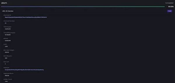 作为 Atomicals 协议最简单的玩法,多个 ARC-20 代币已经被社区成员铸造完成。其中 $ATOM 是第一个诞生的 ARC-20 代币,成为 Atomicals 协议的代表性代币。其总量为 2100 万个,目前在 $ATOM 价格达到了 $1.55,总市值约为 3000 万美元。对标 $ORDI 超过 4 亿美元的市值,$ATOM 的想象空间巨大。