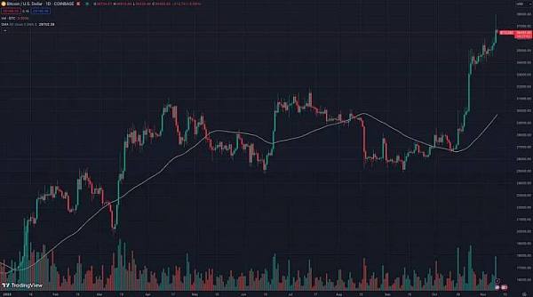 对于现货 ETF 的预期再次使得 BTC 从 $25000 的底部区间上涨,并创下了今年的新高。10 月 16 日,Cointelegraph 报道了关于 SEC 批准现货 ETF 的假消息,BTC 一度向上插针至 $30000 附近,但市场并未因此完全回撤,而是在 MA120 附近盘整,而后继续上涨。显然,我们正处于「人心思涨」的阶段,市场做多的情绪已经被点燃。