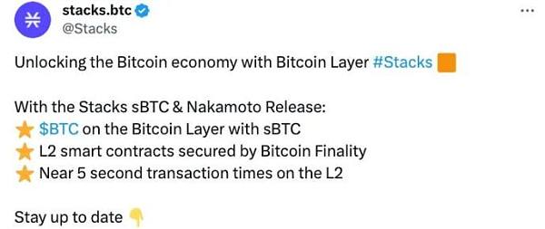10 月 20 日,Stacks 发布了 sBTC 开发者版本,可供开发人员开始构建使用 sBTC 的应用程序,以及测试存款和取款等基本功能。sBTC 是 Stacks 层上 1:1 对应 BTC 的资产,可访问智能合约,用于 DeFi 和 NFT 等应用。Stacks 计划于 2024 年第一季度发布 Nakamoto 升级,大幅提升网络的安全性和运行速度。