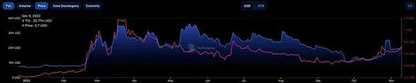 近期 STX 的价格和 TVL 双双回升,TVL 超过 2000 万美元,市值达到 10 亿美元。目前 STX 是比特币生态中市值最大的二层协议,拥有最多的 Dapp,可以捕获比特币上涨带来的溢价从而跑赢大盘。未来完成 Nakamoto 升级后,STX 生态将迎来进一步的爆发。