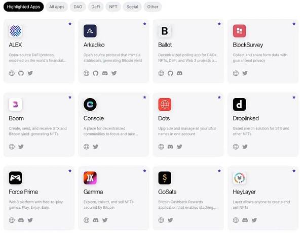 Stacks 是一个基于比特币的 Dapp 和智能合约的区块链网络,类似于比特币上的侧链或者 Layer 2,并拥有 DeFi、NFT、DAO 等相对完整的生态应用。STX 是其发行的原生代币,用于支付手续费和智能合约费用。