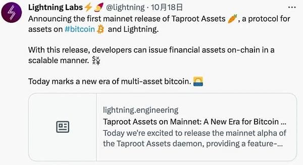 Lightning Labs 于 10 月 18 日发布了 Taproot Assets 主网的 Alpha 版本,使得开发者可以在比特币区块链网络上发行和管理稳定币及其他资产,开启了比特币生态新的可能性。