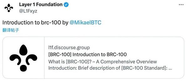 10 月 25 日,BRC-20 开发者@domodata 成立的基金会 Layer 1 Foundation 发布了 BRC-100 的介绍。BRC-100 是一种基于序数理论的可扩展的去中心化计算协议,专为直接在比特币第一层上的去中心化应用程序设计,例如 DeFi、SocialFi、GameFi 等。BRC-100 从 BRC-20 扩展而来,并且可以扩展和改进,为基于比特币第一层的应用创造可能性。