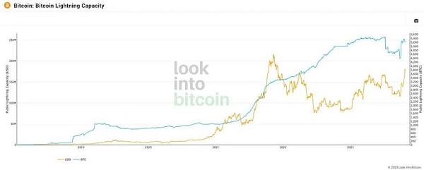 闪电网络所有节点累计持有的 BTC 稳步上升