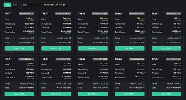 Nostr Assets Protocol 在 10 月 30 日率先上线了 Taproot Assets 主网,并同时发布万圣节的空投代币 $TREAT 和 $TRICK。二者的总量均为 2.1 亿个,共计 4.2 亿个,白名单用户可选择获得 10000 个其中一种代币,约有 8000 个地址领取了 8000 万个代币。目前的市场价格约为 $0.09,合计流通市值为 700 万美元,合计 FDV 为 3800 万美元。项目方拥有其余的代币,可能在未来推出更多的玩法和用途。