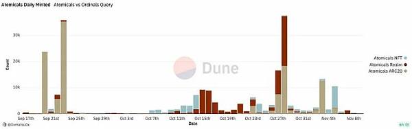 与 Ordinals 协议相比,Atomicals 协议的设计更加细致,内置了代币、NFT、领域、容器等模块,为开发者和用户提供了多种常用功能。自 9 月 17 号上线以来,该协议迎来了诸多开发者和用户,已上线钱包、浏览器、铸造平台、域名服务等工具,铸造量达到了数万次,目前仍在高速增长。
