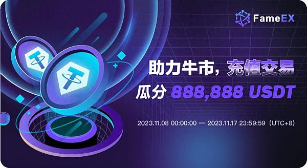 11月8日,为庆祝主流币行情连续走高,FameEX 平台面向所有用户推出“助力牛市,充值交易瓜分 888,888 USDT” 交易狂欢活动。该活动旨在回馈新老用户,丰富用户的交易体验,并打造多元化的加密交易生态。根据公告显示,本次活动在2023年11月08日至11月17日进行,共分为两部分,奖池总金额高达88万USDT。以下是活动的具体内容:
