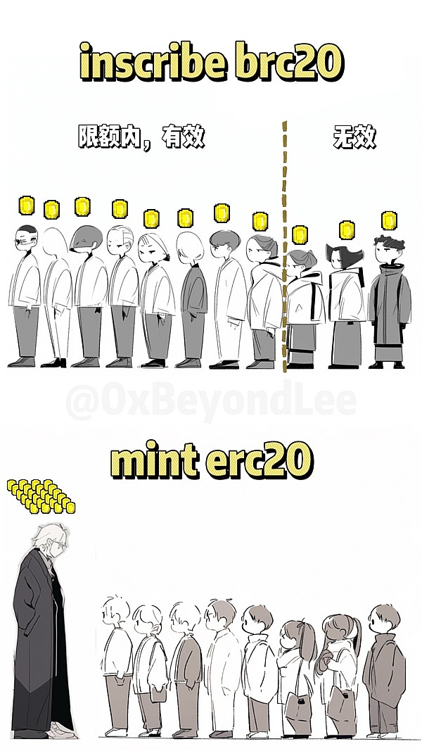 代币:BRC-20 在比特币区块链上使用工作量证明机制,而 ERC-20 在以太坊区块链上使用权益证明机制。BRC-20 代币标准也不支持智能合约。BRC-20的交易基于PSBT技术,ERC-20 代币交易基于智能合约。而两者的发行和铸造也有明显的差别。可以参考下图。