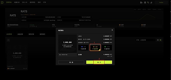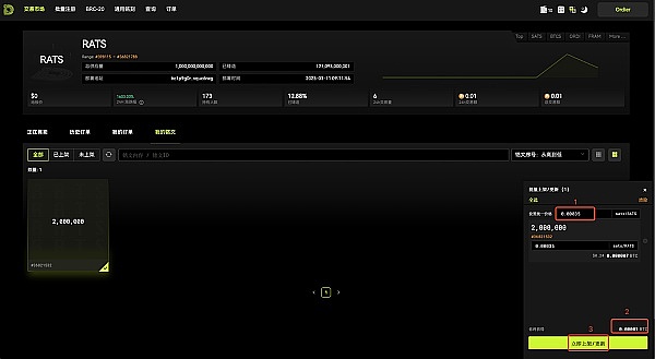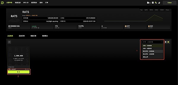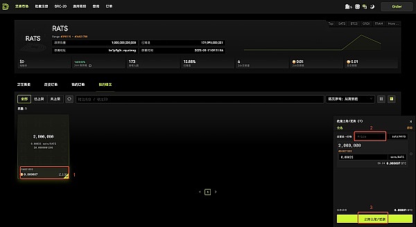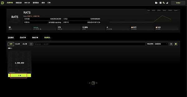 1.搜索需要购买的铭文,以RATS为例,点击铭文进入详情列表,找到价格合适的挂单,点击购买