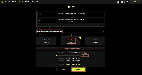 铭文预留:预留聪可以自定义调整。建议使用bc1q开头的地址,这样预留聪降到最低294,费用最省。