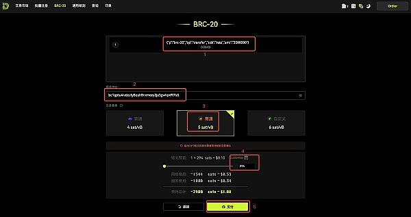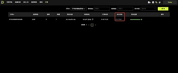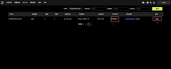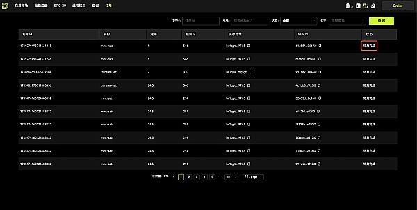 6.支付成功后,自动跳转到订单页面,展示订单的订单ID、金额、速率(提交订单时的gas费)、数量、铭刻的内容(铸造的铭文)、收款地址、订单时间 、支付状态、铭刻进度